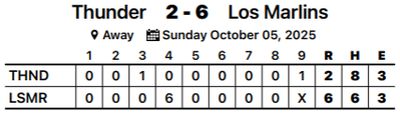 The Marlins sank the Thunder by scoring all six of their runs in the fourth inning. Joe Ferro tossed a scoreless first inning, Kody Gardere followed with a scoreless second and third inning, but the wheels fell off in the fourth, as the Marlins led off the inning with a single, a double, three wild pitches, then a walk before Gardere was replaced with Sammy Camacho. Camacho struck out the first batter he faced, gave up a single, then an inning ending double-play ground ball was misplayed and the flood gates opened further with three more singles, giving the Marlins a 6-1 lead that they would not relinquish.