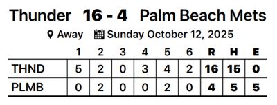 Mike DeLeeuw showed a strong eye at the plate on Sunday, as DeLeeuw walked three times while leading Thunder to a 16-4 victory over Palm Beach Mets.