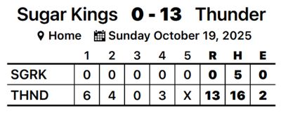Luis Manuel La Rosa stepped on the mound first for Sugar Kings. The starter surrendered four hits and six runs over one-third of an inning, striking out none and walking two. Kody Gardere and Erick Abreu each came on in relief for Thunder and shutdown Sugar Kings.