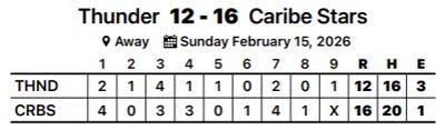 Bats were blistered on Sunday at Santaluces Community High School, but Thunder couldn't quite get the job done against Caribe Stars and lost 16-12. Caribe Stars collected 20 hits, while Thunder had 16.